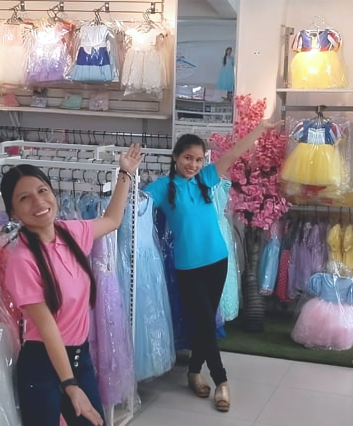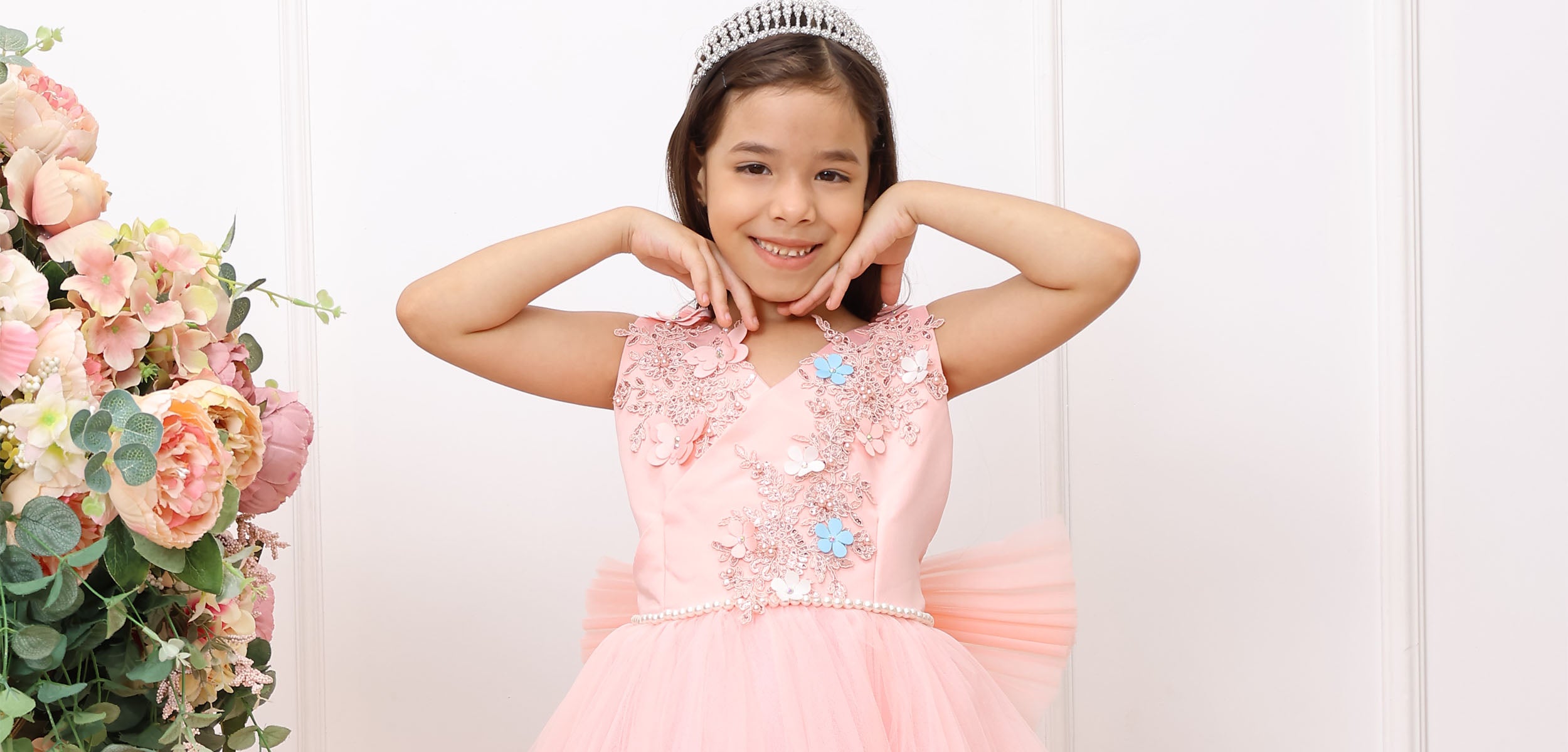 En suave rosa quartz, con flores en relieve y detalles de perlas. Su falda de tul en capas es perfecta para que tu pequeña luzca como una princesa.